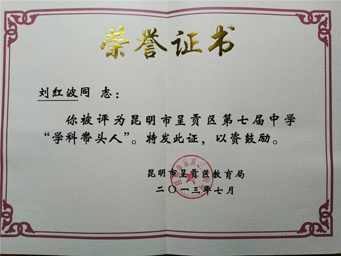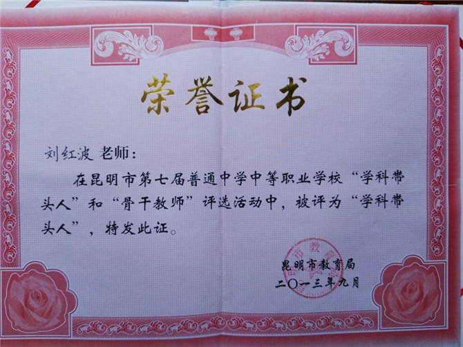 成功,往往只屬于勇于不斷沿著陡峭山路攀登的人。功夫和創新,使他取得了連自己都意想不到的成績:2008年參加呈貢縣初中復習課競賽,榮獲數學學科一等獎;2010年參加昆明市初中數學課堂教學競賽,榮獲二等獎;2011年參加呈貢縣中小學課堂教學競賽,榮獲初中數學組一等獎;2012年參加呈貢區中小學課堂教學競賽,榮獲初中數學組一等獎;2013年被評定為呈貢區中學數學學科帶頭人;參加昆明市第七屆中學學科帶頭人評選,被認定為昆明市級數學學科帶頭人。