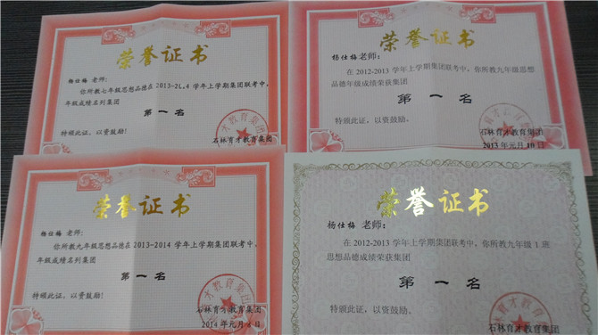 2015年隨著中考的改革,思品等五門學(xué)科,不再列為主科,在中考成績中只占10分。面對(duì)學(xué)科分值的降低,楊仕梅老師的工作情緒并沒有受到任何影響。她恪盡職守,一如既往地教好思品這門學(xué)科。她堅(jiān)持做好作業(yè)“三清”常規(guī)管理,仍像主科老師那樣認(rèn)真?zhèn)浜妹恳还?jié)課,上好每一節(jié)課,對(duì)每一個(gè)單元知識(shí)及時(shí)進(jìn)行檢測評(píng)講。2016年中考,她所教的九年級(jí)兩個(gè)班的思品成績再次名列前茅。