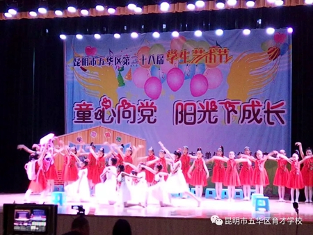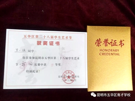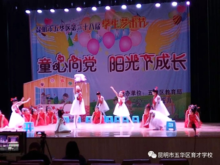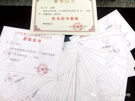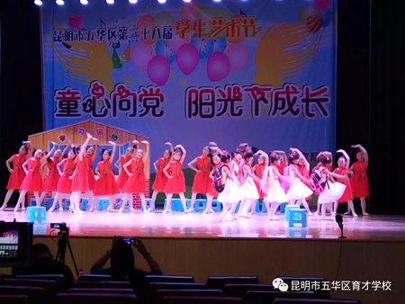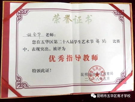 昆明市五華區(qū)育才學校舞蹈隊情景舞蹈《明天我要上學了》參加五華區(qū)第二十八屆中小學生藝術節(jié)“童心向黨 陽光下成長”舞蹈比賽活動。在昆明市五華區(qū)公民辦小學28個參賽隊中脫穎而出,獲得9.901分的好成績!喜獲一等獎,創(chuàng)學校歷史新高!胡金華老師也被評為優(yōu)秀指導教師!