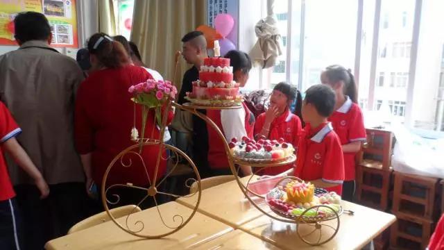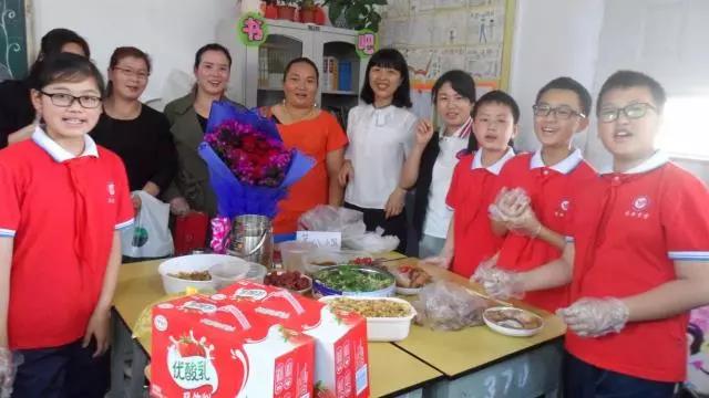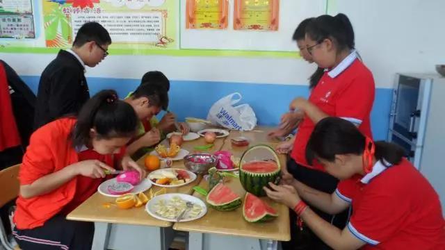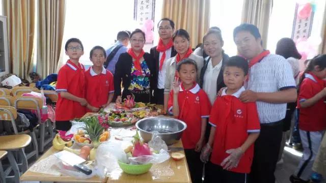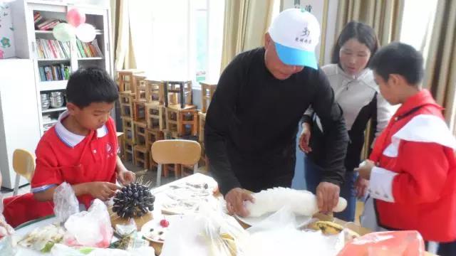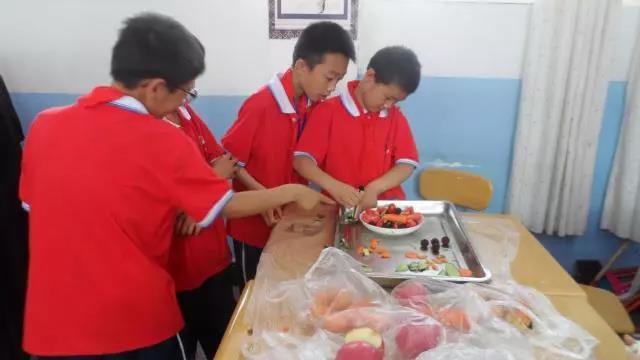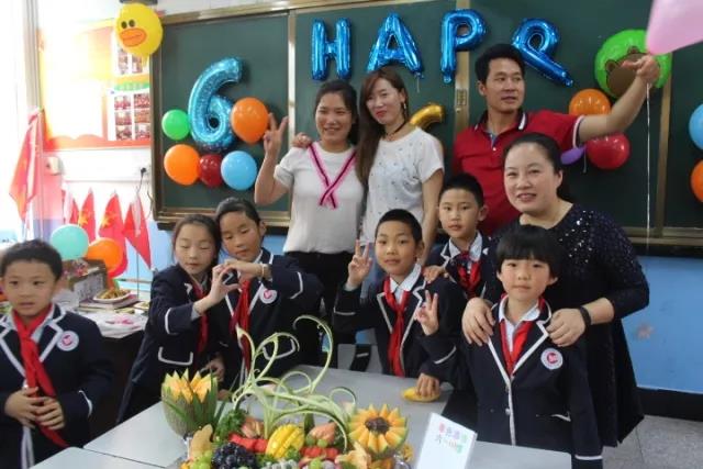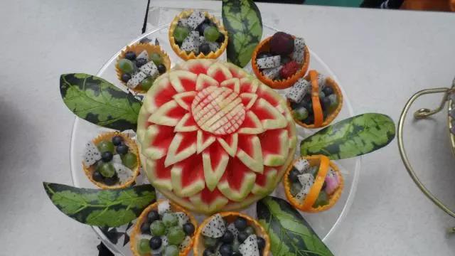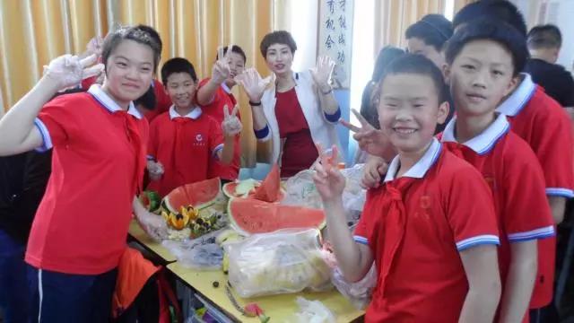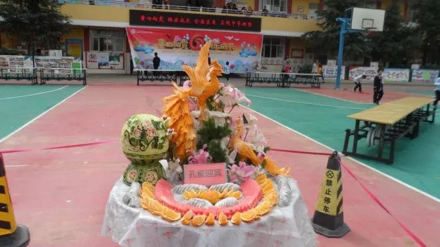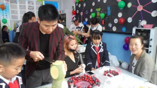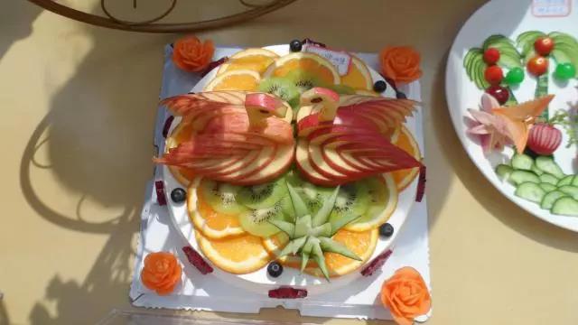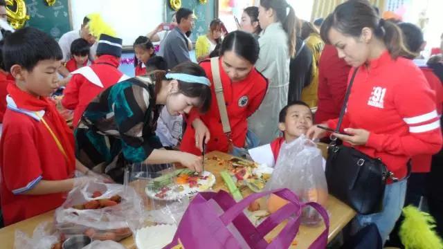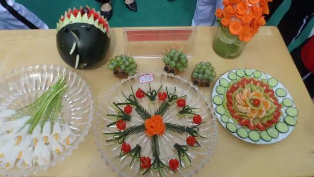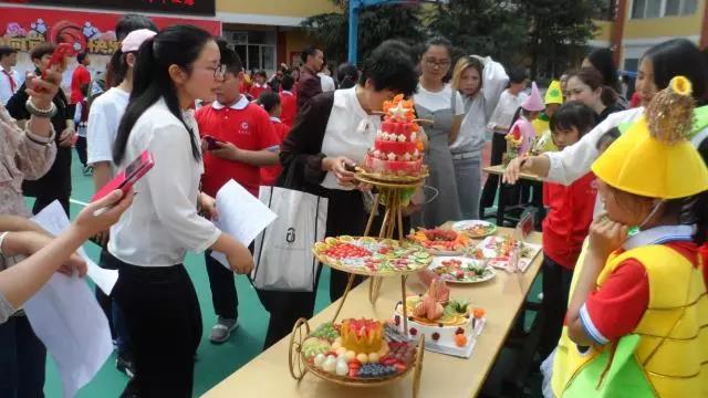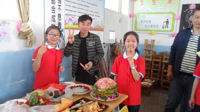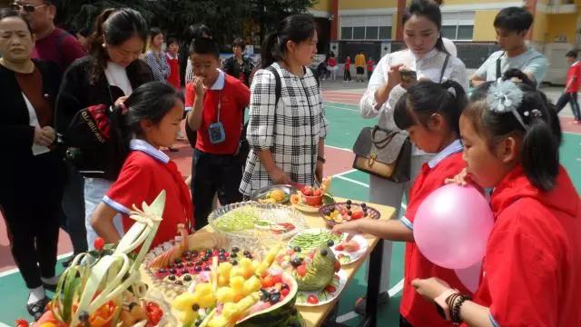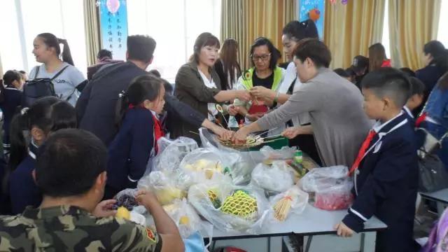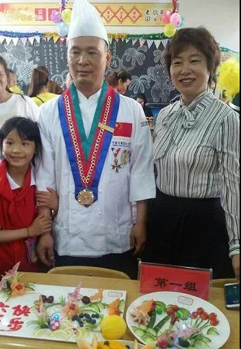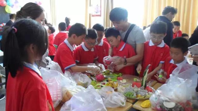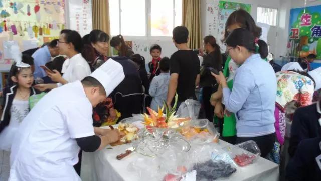 在“親子水果拼盤制作”這一環節中,小學部12個班級,中學部4四個班級和幼兒園家長、老師。每班組成5--8個親子小組,每個組成員在規定的時間內,把西瓜、圣女果、橘子、黃瓜、蘋果、香蕉、菠蘿、蘋果、金桔等各式各樣水果、蔬菜,雕刻成藝術品,擺放在拼盤里,在家長和孩子們的創意和精細的刀工下,被改造成片、丁、絲、塊、圓、方等形狀,拼放成各種圖案和各種架勢,在家長和同學們巧手妝點下,各種普通的水果被賦予靈動的生機:有的憨態可掬,有的栩栩如生,精致美麗,美輪美奐得讓人垂涎欲滴又不忍落口。在制作過程中,幾個家庭成員彼此團結一致,獻計獻策,齊動手,師生情、母子情,父子情如溫暖的春風蕩漾在每個人的心間,教室里洋溢著歡樂的笑聲。筆者在現場看到一位特別的家長,他是三(1)班黃馨元同學的爸爸黃天平,黃天平先生是酒店大廚,曾在全國美食節大賽中榮獲金獎,為了能參加這個活動親子活動,他特地提前結束在英國的培訓,從國外趕回來參加。并在現場發揮他的鬼斧神刀制作了幾件精美拼盤,同時協助他組完成制作。黃天平這種為班級榮譽而付出的精神感動了其他家長,校長盧艷為此來到三(1))班級看望他,代表學校感謝他對學校工作的支持。