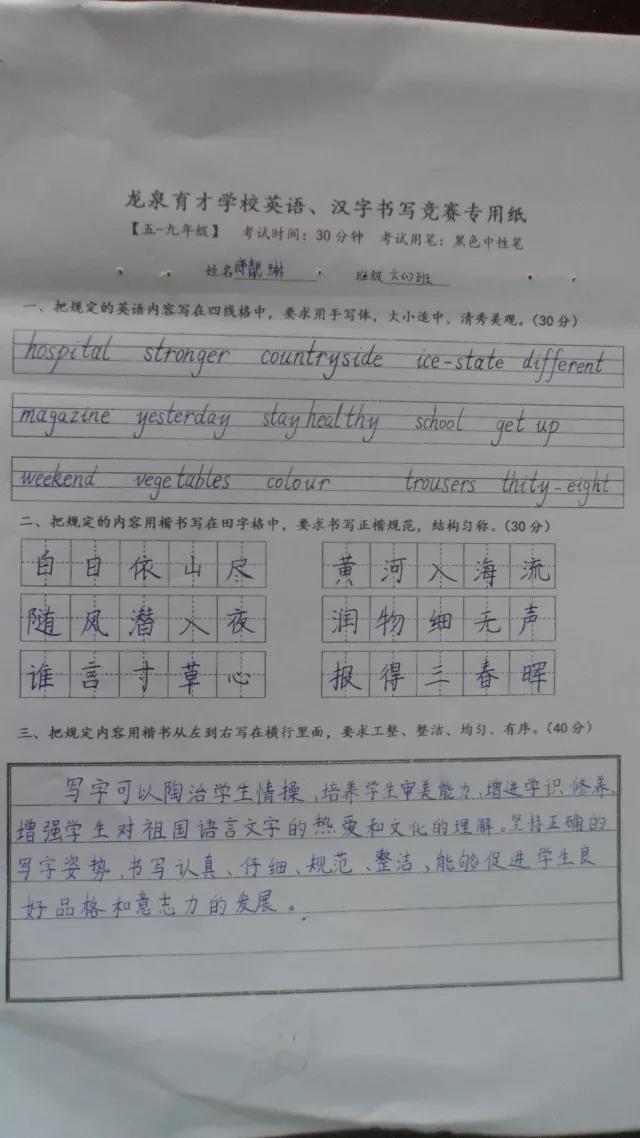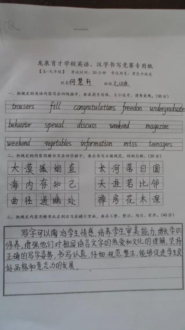 一風漢字千年魅,百味中文萬里香,學校通過開展規范書寫一系列的活動,讓學生感悟到漢字的美,書寫規范重要性,同時認識到自己平時在學習過程中存在的不足,從而自覺養成認真規范書寫的良好,賽后很多同學都紛紛表示,今后一定要把漢字和英語書寫好,寫漂亮。