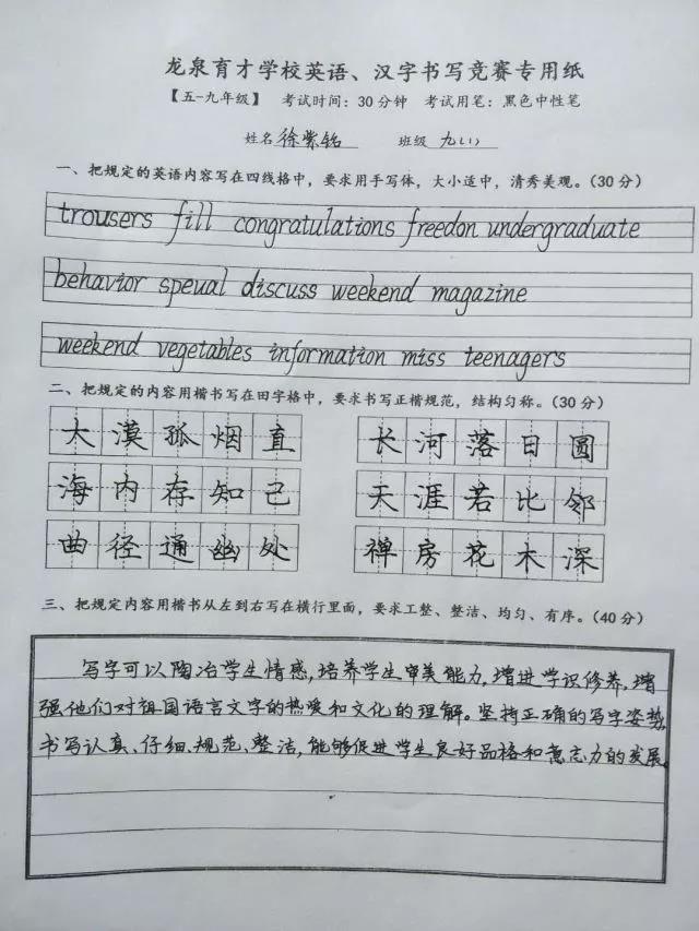 為傳承中華優秀傳統文化,展示漢字魅力,提高學生書寫能力和水平, 2017年11月30日上午,學校舉行了漢字、英語書寫比賽活動,一到九年級全體同學以飽滿的熱情參加了活動,在比賽中個個認真對待,書寫工整規范。比賽結束后,中、小學語文課任教師交叉評出年級一等獎2名,二等獎4名,三等獎4名。獲獎的同學共計一百人,學校給獲獎的同學頒發了獎狀和獎金。