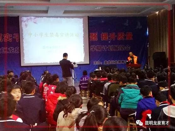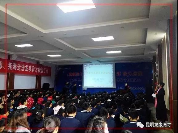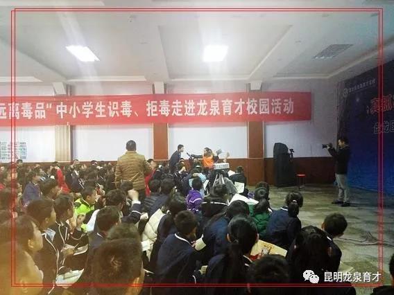 由昆明龍泉育才學校和云南陽光公益攜手組織的“珍愛生命、遠離毒品”中小學生識毒、拒毒走進龍泉育才校園活動,活動于2017年12月8日周五下午14:30準時開始,龍泉育才學校部分教師及學生家長有50人,學生360人,陽光公益志愿者9人,昆明教育電視臺2人,共計420余人參加活動。本次活動得到云南省公安廳禁毒局的指導與支持,昆明教育電視臺、龍泉育才學校電視臺全程報道本次活動,陽光公益志愿者李佳主持開場并介紹到場嘉賓。