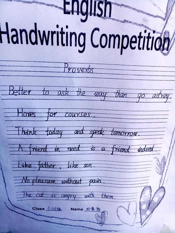 本次英語書寫比賽,極大地激發了學生學習英語的熱情和興趣,提高了學生對英語書寫規范化的重視,豐富了學生的學習生活,同時也享受到了英語學習的樂趣,給孩子們提供了一個很好地鍛煉和展示自我的平臺。
