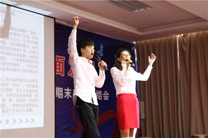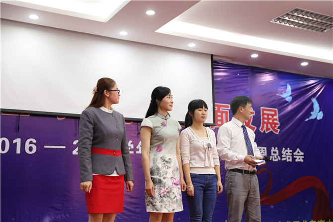 感恩大會在幼兒園教師們表演的開場鼓《龍鼓起航》中拉開序幕。在這個篇章里,以成兵、聞磊、賀緘、何韻蓉為代表的四位教師,分別上臺作總結感恩:成兵老師以《八年級嚴重分化困局的破解》為題,向大家介紹了本屆八年級的優勢以及如何破解嚴重分化的局面。在講述中,成老師風趣幽默,引用許多典故、名人名句,給會場帶來了輕松歡快的氣氛。英語老師聞磊,她所教的九年級英語在這次中考估分中實現了重大的突破,她在講述《如何實現學生優秀率、及格率的突破》專題時,聞磊老師通過八年級下冊成績與中考估分對比表,讓大家看到了九年級英語老師背后的艱辛付出。當她回憶起學生在中考那幾天走出考場,個個歡聲雀躍地擁抱她,并紛紛感謝她三年來的教導時,聞老師禁不住滿臉淚花,激動得幾度哽咽。