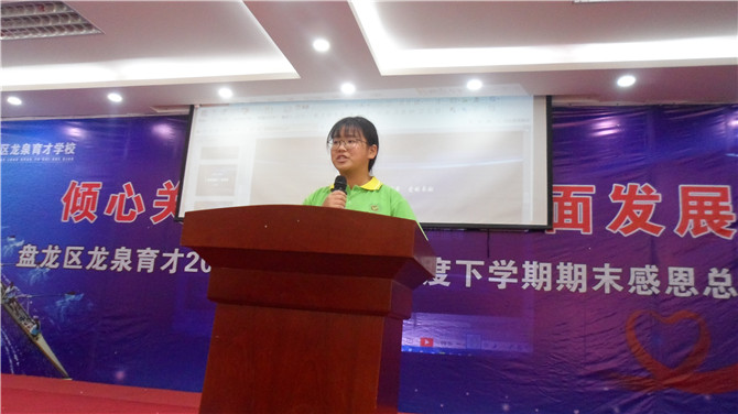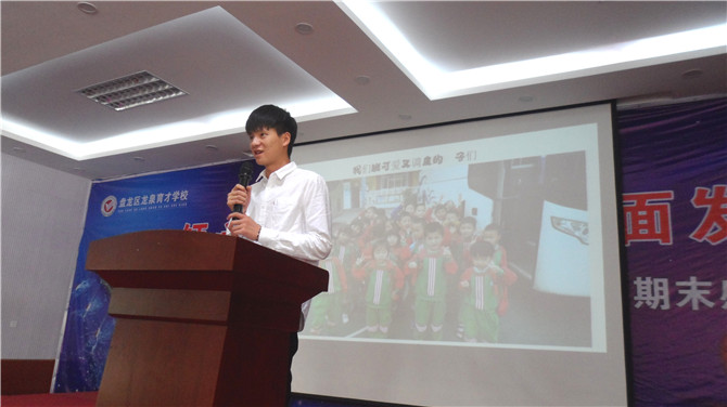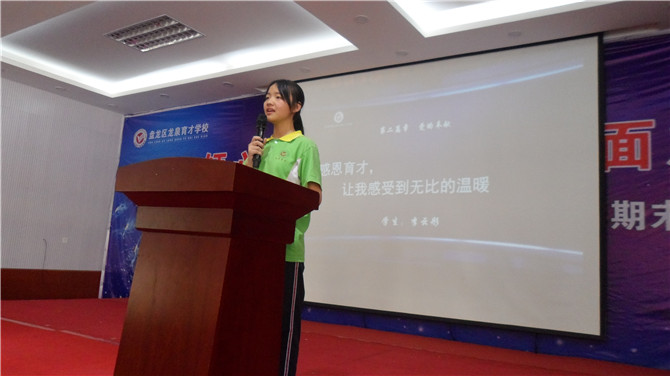 龍泉育才是充滿愛的樂園,因為有愛,所以一些離開育才的孩子又重新返回育才就讀;因為有愛,所以長期留校的孩子們才感到春天般的溫暖。八(1)班學生李蕓彤和八(2)班學生梁譯心也分別上臺進行了演講。她們講述了被老師濃濃的愛所包圍的故事,深深感激育才老師在她們自暴自棄時,用愛心和耐心幫助她們恢復自信,讓她們重新燃起學習的斗志。