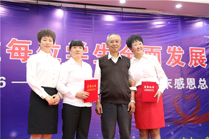 鄒宜欣和媽媽一起上臺發言,表達了對盧艷校長(左一)和班主任王熙鳳老師(右一)的感激之情