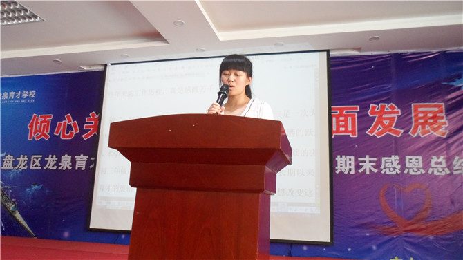 本學期龍泉育才學校舉行的大型活動“誦中華經典,創文明城市”在社會及媒體引起了極大的反響,小學語文組組長何韻蓉老師深情回憶了此次活動背后一件件感人的故事,她由衷地感謝所有參與的老師和后勤職工,是因為大家齊心協力才讓學校200多名學生走上了舞臺,在精彩的節目表演中展示自我,讓“經典誦讀之花”在學校散發清香。賀緘老師入職才一年,但她潛心耕耘,成績斐然。她說,是育才這個大家庭給予了她許多溫暖和鼓勵,是團結務實的英語教研組讓她選擇了努力奮斗;今后,她將懷著一顆感恩之心,繼續為學校的發展做出貢獻。