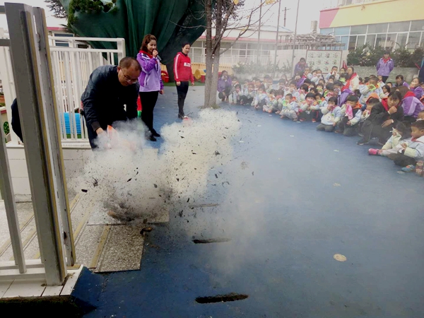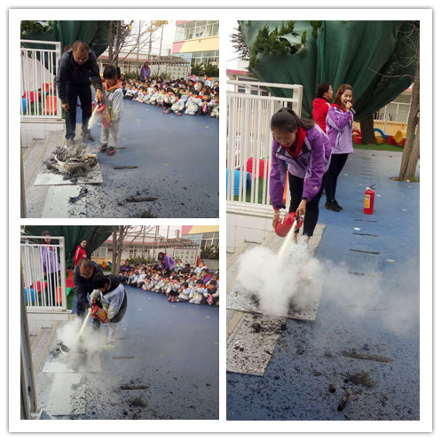 隨后柏曉艷副園長為大家講解手提式干粉滅火器的正確使用方法,王成順老師進行了示范:一提、二拔、三對準、四噴。通過細致地講解和操作演示,讓全體教師進一步鞏固了滅火器的用法,老師們紛紛上臺親自體驗并動手操作示范。為了加強幼兒的實操性,體驗感受滅火器的神奇功能,在老師的安全指導下,大班幼兒積極踴躍參與到嘗試使用滅火器活動體驗中。