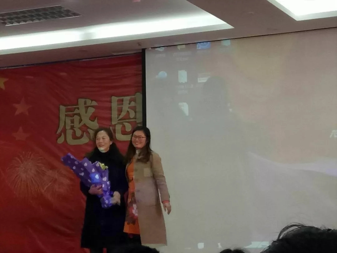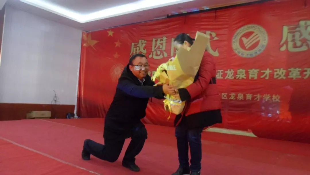 在教師代表發言的中,有一位特殊的人才,他就是朱曉華老師,朱老師從事的工作是最繁瑣的學籍管理,平時他一著急就說不話來了,臉都憋紅了,可是今天的他卻口若懸河,以風趣詼諧的話輕輕松松地講述他十幾年來在育才奮斗、買房、買車、家庭生活幸福的故事,讓全場樂翻天笑翻天。借此機會他深深地感恩一路相遇的每一個人的幫助和支持,特別是當他下跪把鮮花送給和自己一起奮斗的夫人楊老師時,大家更是把手都拍紅了。