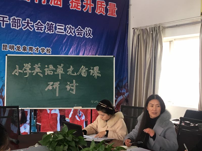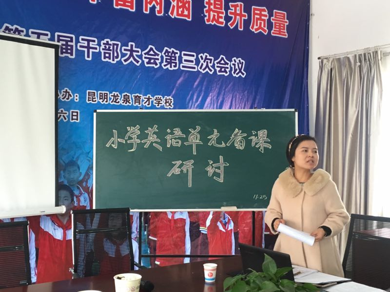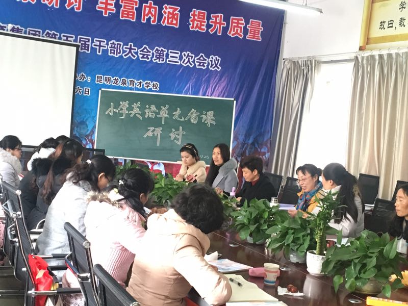 小學英語教師在平時使用教材中,往往會遇到這樣一個問題,即教學課時不足與教材容量偏大的矛盾,為突破口解決英語教材使用中的瓶頸難題,更有效地引領老師們進行單元備課,建立單元備課模型。2017年11月25日上午,云南育才教育集團小學英語組的全體成員在昆明盤龍區育龍泉育才學校開展“小學英語單元備課”研討活動。到會指導的有昆明呈貢區的朱老師、集團專家李正滋、集團督學趙忠瑞、負責教研工作的楊麗芳和楊仕梅等。